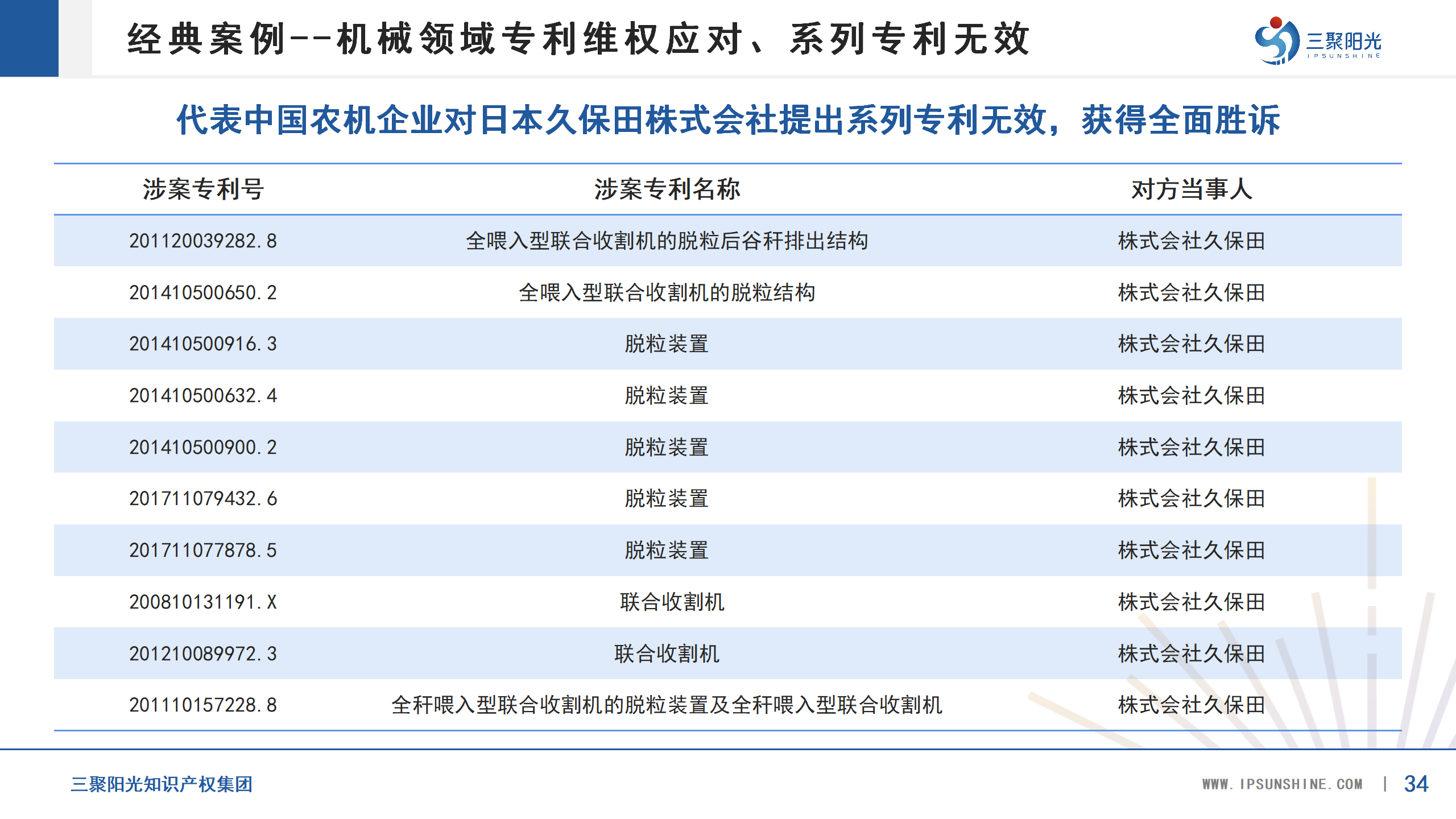 代表中國農(nóng)機(jī)企業(yè)對(duì)日本久保田株式會(huì)社提出系列專利無效,獲得全面勝訴