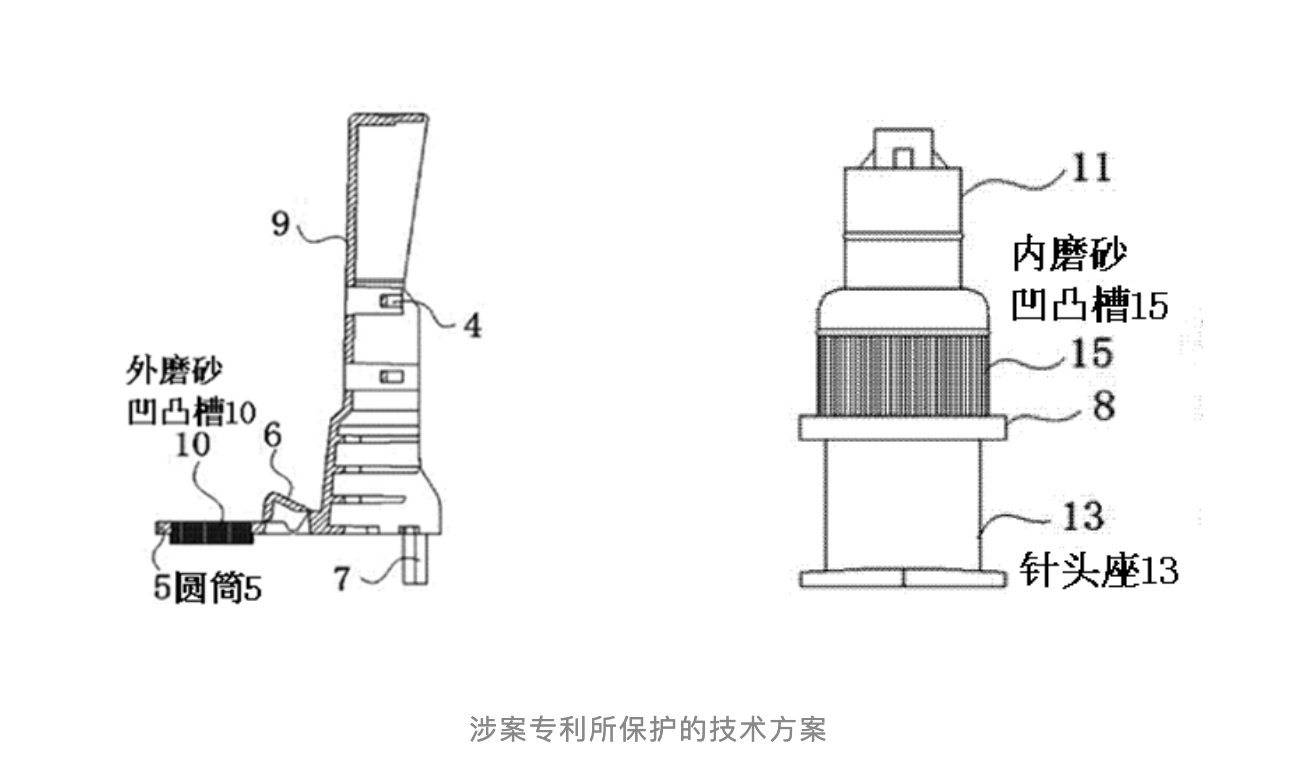 揚(yáng)州美德萊公司主張:該區(qū)別技術(shù)特征所起的作用“并非僅是增加安全針套連接段與圓筒之間的摩擦力”,還具有“可以使醫(yī)生將套筒旋轉(zhuǎn)時(shí)手感更加清晰,便于醫(yī)生快速將套筒旋轉(zhuǎn)到合適的位置”這一額外效果,現(xiàn)有證據(jù)沒有針對(duì)該額外效果給出技術(shù)啟示。在無效宣告程序及二審?fù)忂^程中,專利權(quán)人均當(dāng)庭演示了其所聲稱“專利產(chǎn)品”實(shí)物,實(shí)物的圓筒與針頭座之間設(shè)有磨砂凹凸槽,在二者相對(duì)轉(zhuǎn)動(dòng)時(shí)確實(shí)有“咔噠咔噠”的清晰手感(即前述額外效果)。國家知識(shí)產(chǎn)權(quán)局支持專利權(quán)人主張維持涉案專利有效。
