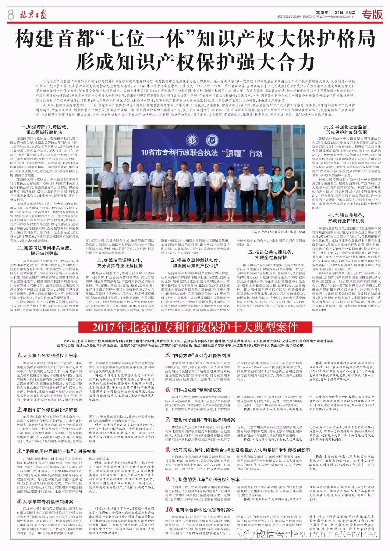 日前,北京知識產(chǎn)權保護協(xié)會受北京市知識產(chǎn)權局委托,舉辦“北京市2017年專利行政保護十大典型案件”評選。經(jīng)過社會公眾的網(wǎng)絡投票,以及審議、公示后,由三聚陽光代理的“中國質(zhì)量萬里行‘防偽方法’系列專利侵權糾紛案”、“摩拜單車專利侵權糾紛案”入選。4月24日出版的北京日報專版予以報道。