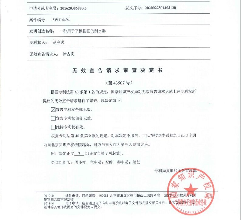 日前,由三聚陽(yáng)光代理的一項(xiàng)專利無效宣告案勝利結(jié)案。在國(guó)家知識(shí)產(chǎn)權(quán)局作出的第43507號(hào)無效審查決定中,專利權(quán)人趙利強(qiáng)先生擁有的專利號(hào)為201620386880.5 的”一種用于平板拖把的刮水器“專利,專利權(quán)被宣告全部無效。此案中,三聚陽(yáng)光代理方為請(qǐng)求人徐占慶先生。