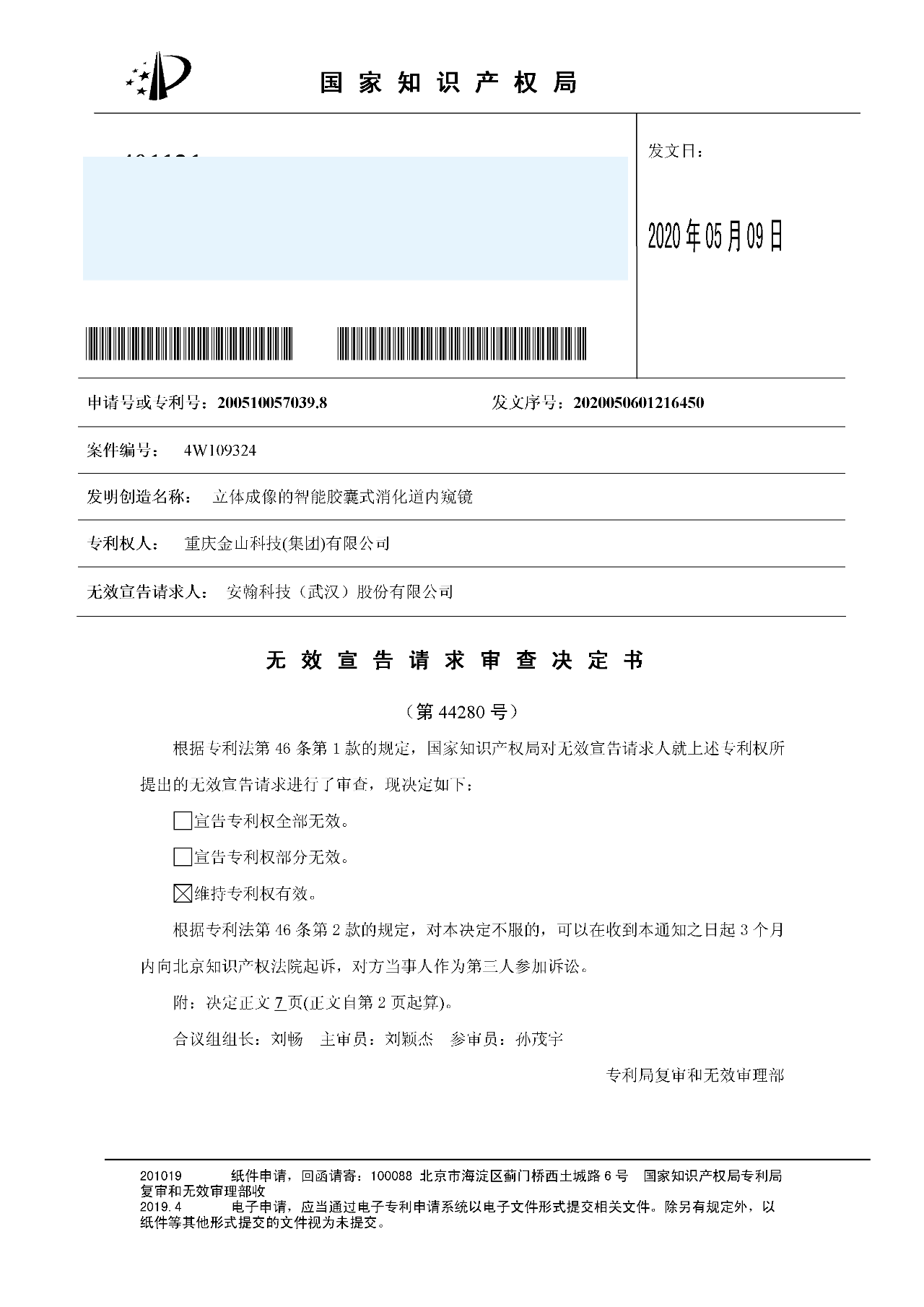近日,三聚陽光及旗下易聚律所代理的專利權(quán)人重慶金山與安翰科技的一起發(fā)明專利無效宣告案勝利結(jié)案。國家知識(shí)產(chǎn)權(quán)局作出第 44280 號(hào)審查決定,維持重慶金山專利號(hào)為“200510057039.8”、名稱為“立體成像的智能膠囊式消化道內(nèi)窺鏡”的發(fā)明專利專利權(quán)全部有效。