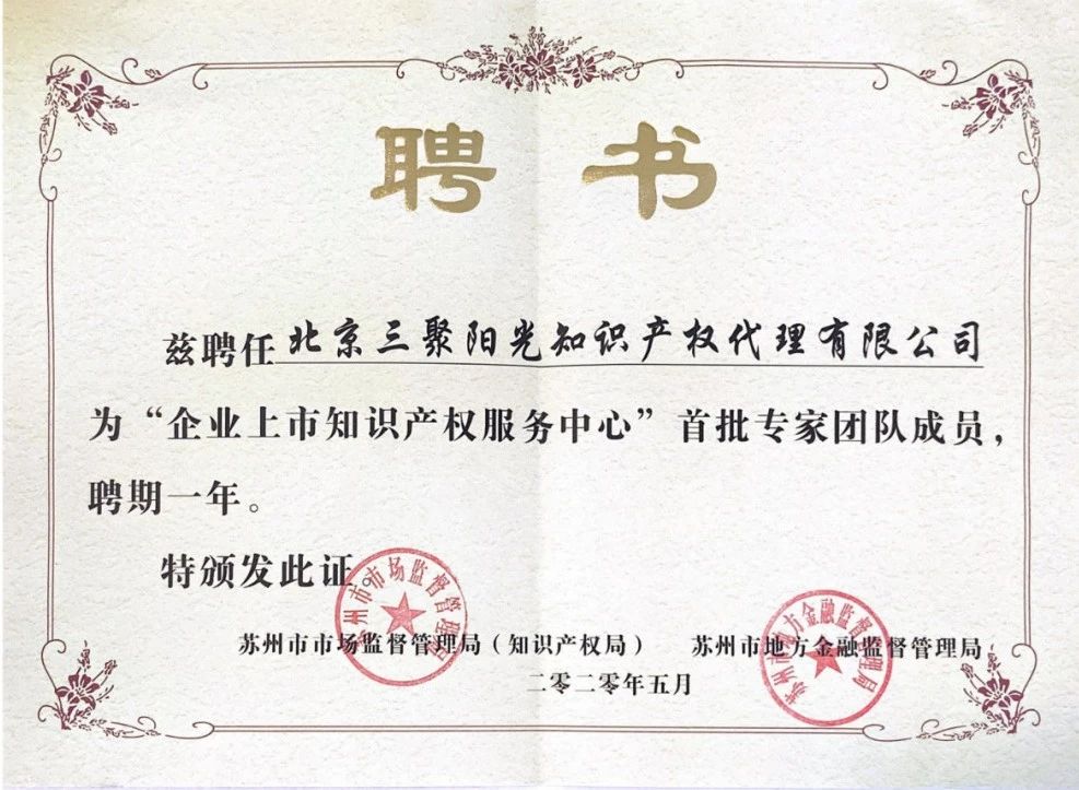 5月21日,蘇州市市場(chǎng)監(jiān)督管理局和蘇州市地方金融監(jiān)管局聯(lián)合舉辦了“知識(shí)產(chǎn)權(quán)助力科創(chuàng)企業(yè)上市”主題活動(dòng)。在“企業(yè)上市知識(shí)產(chǎn)權(quán)服務(wù)中心”啟動(dòng)儀式上,三聚陽(yáng)光接受了監(jiān)管局領(lǐng)導(dǎo)頒發(fā)的聘書(shū),正式成為首批入選蘇州市企業(yè)上市知識(shí)產(chǎn)權(quán)服務(wù)中心的專家團(tuán)隊(duì)。