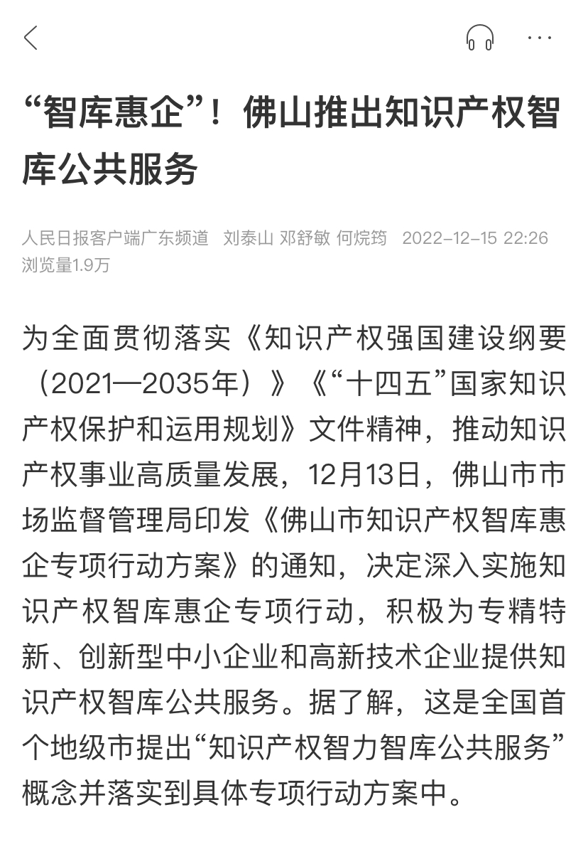 據(jù)人民日報客戶端報道,佛山市市場監(jiān)督管理局近期印發(fā)《佛山市知識產(chǎn)權(quán)智庫惠企專項行動方案》的通知,文件提到佛山市將深入實施知識產(chǎn)權(quán)智庫惠企專項行動,積極為專精特新、創(chuàng)新型中小企業(yè)和高新技術(shù)企業(yè)提供知識產(chǎn)權(quán)智庫公共服務(wù)。