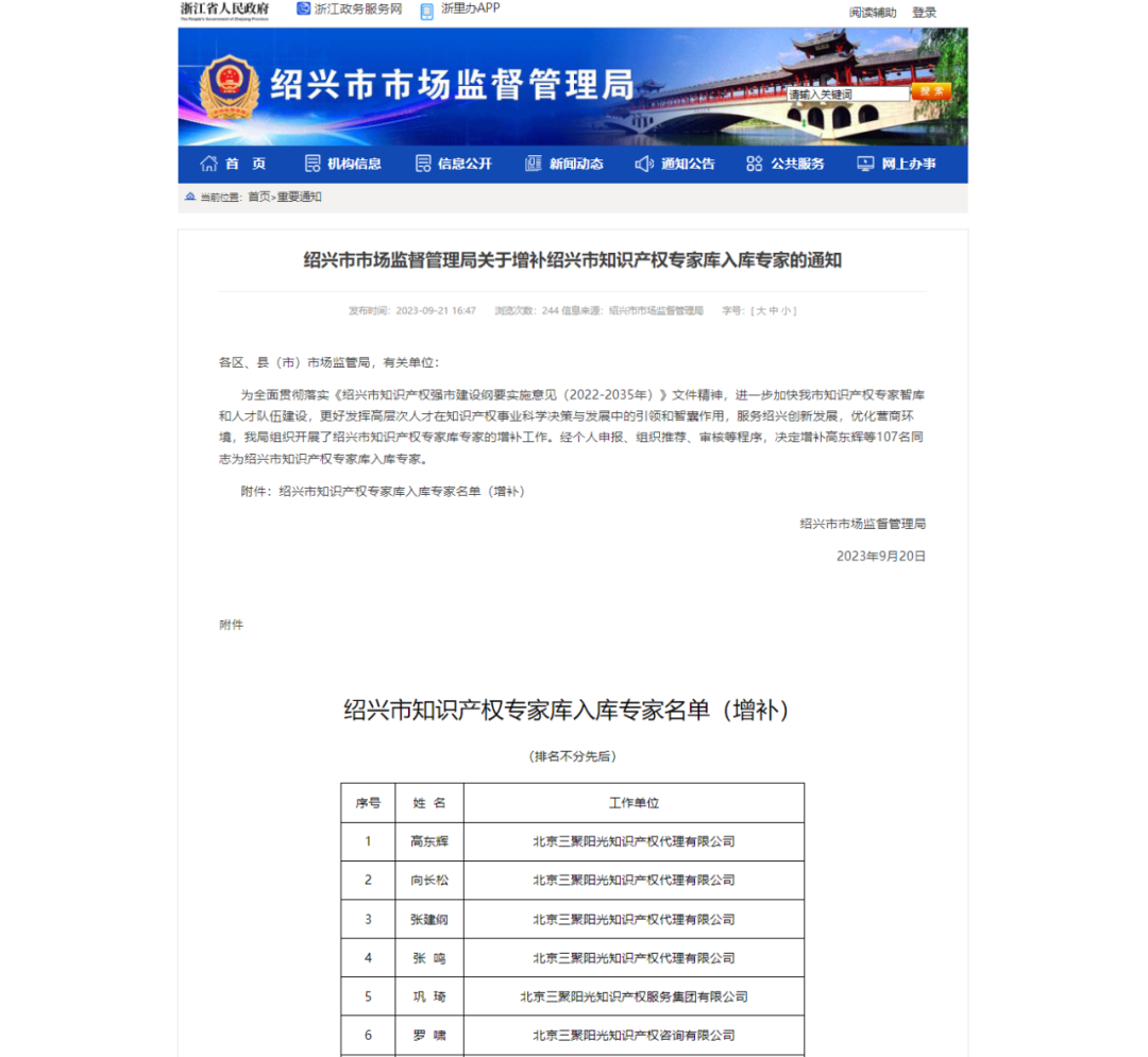 三聚陽光六位專家入選紹興市知識產(chǎn)權(quán)專家?guī)?