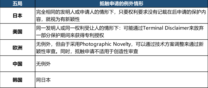 特別要注意,由于以上歷史原因,日本的“抵觸申請(qǐng)”條款不包含同一申請(qǐng)人或同一發(fā)明人的情形,所謂“相同”指代發(fā)明人完全相同或申請(qǐng)人完全相同。如果在先在后提交的兩份相同的申請(qǐng)的發(fā)明人全部相同或申請(qǐng)人全部相同,日本專利局不依據(jù)“擴(kuò)大先愿”駁回,轉(zhuǎn)而依據(jù)第三十九條「先願(yuàn)」的先申請(qǐng)制度,基于在后申請(qǐng)沒有「新規(guī)性」駁回。駁回的結(jié)果一樣,只是依據(jù)不同。中國則沒有這一例外。
