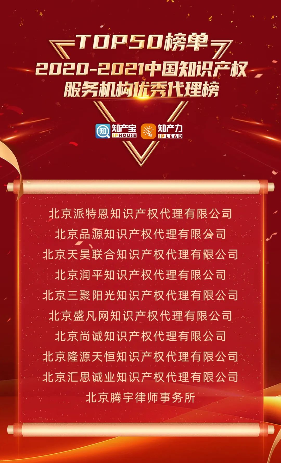三聚陽光上榜“2020-2021中國知識產(chǎn)權(quán)服務(wù)機構(gòu)優(yōu)秀代理榜TOP50”